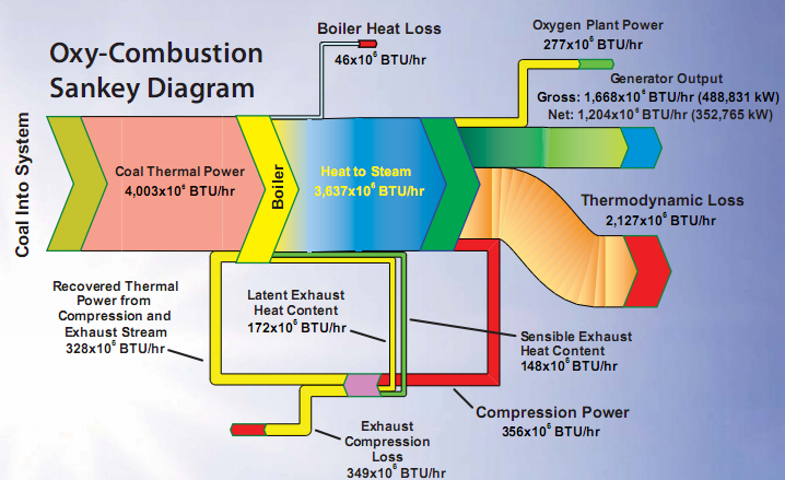 Oxy-Combustion is an emissions abatement solution wherein coal (as well as other fossil fuels) is burned/combusted in the presence of 100% oxygen instead of "atmospheric" air, which contains 20.95% O2 (by volume) along with;